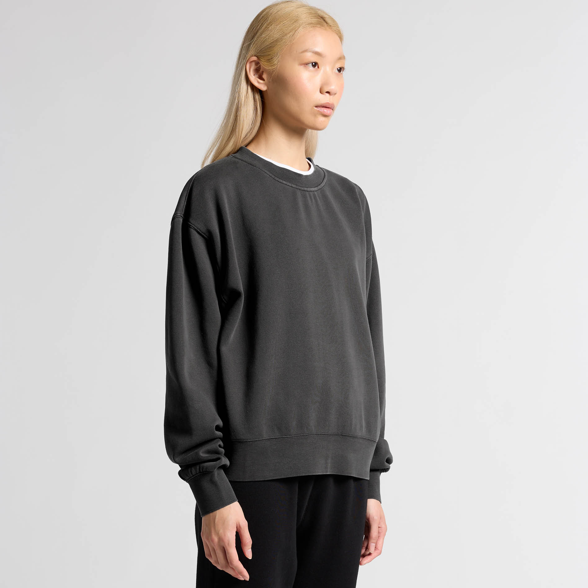 Pullover crew, drop shoulder, crew neck, garment dyed, sleeve cuff ribbing