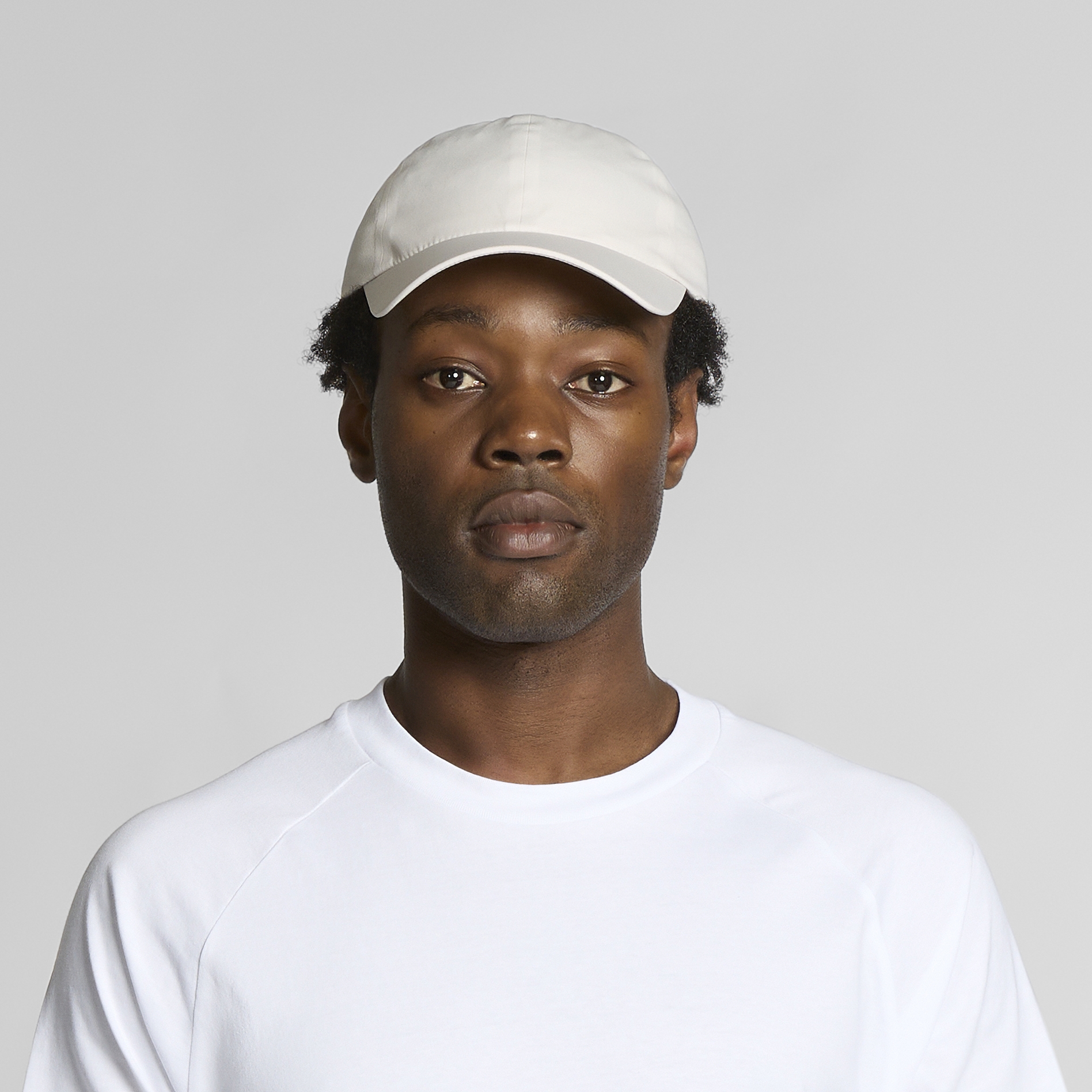 Self-fabric covered Velcro strap to close , stretch unstructured body, tonal under-peak lining
