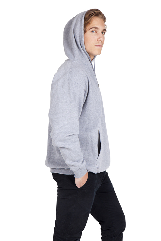 Pullover hood, drop shoulder, cropped full length, self-fabric lined hood, no drawcord, sleeve cuff ribbing